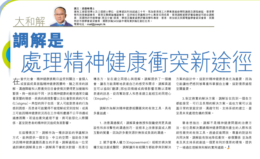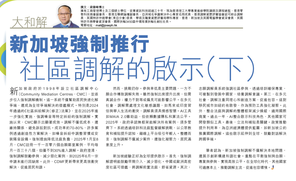 ALTERNATE DISPUTE RESOLUTION 另類解決爭議 BUSINESS 商業 MEDIATION 調解 PUBLIC ADMINISTRATION 公共行政 SINGAPORE 新加坡 社區調解及其對社會的深層意義 (下) September 4, 2025