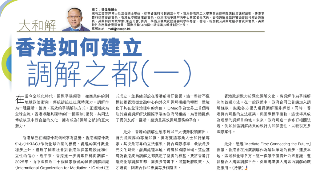 ALTERNATE DISPUTE RESOLUTION 另類解決爭議 BUSINESS 商業 MEDIATION 調解 SINGAPORE 新加坡 國際調解院落戶香港 : 機遇與挑戰 (上) June 13, 2025